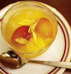 さてと金曜日!めずらしく?店長ミヤザキ謹製デザート!「秋のフルーツゼリー」ぶどうと梨のコンポートにネーブル!ちらりと菊の花を飾りに散らして限定9食!早い者勝ち!(お)