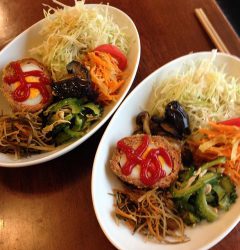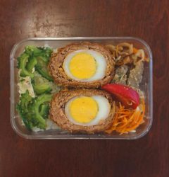 ホールスタッフ、ニッシーの息子さんが骨折しているため、賄いを食べて帰る時間がない!というわけで、持参のお弁当箱にスコッチエッグ弁当を作りましたよ。思いがけず可愛くできたので記念写真です。(麻)