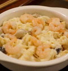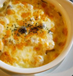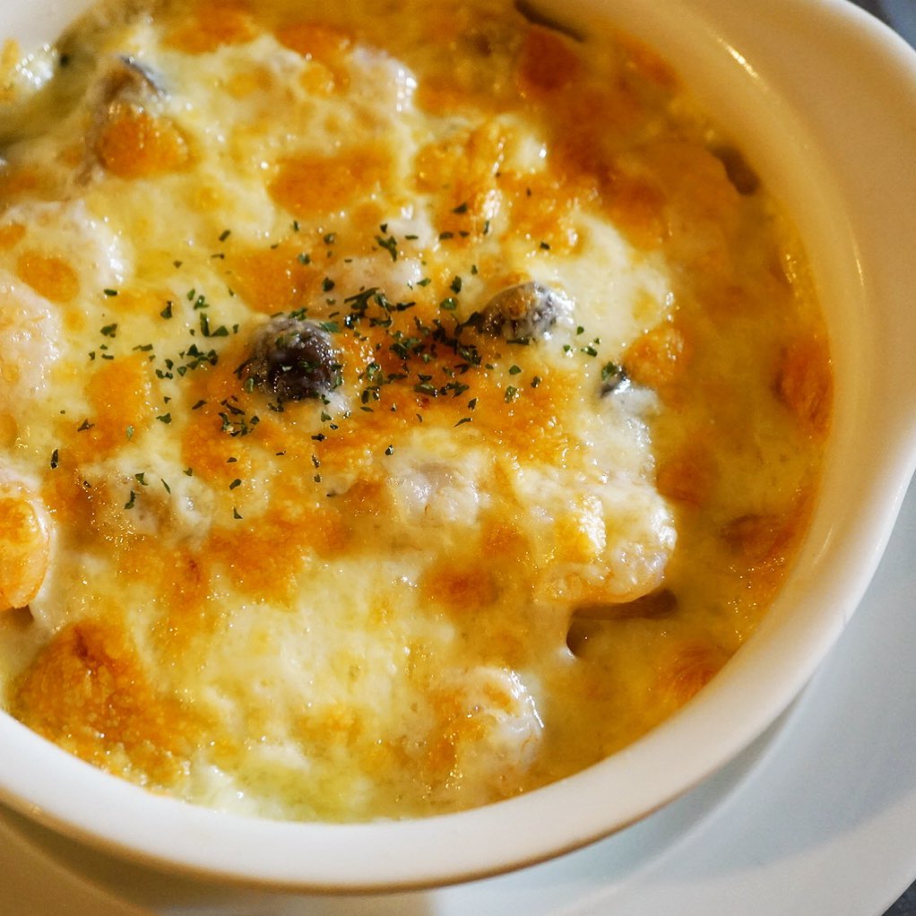さてと今夜も秋の葡萄酒新酒はボジョレ祭り!とあつあつ人気はシンプルな「エビときのこのマカロニグラタン」!とろりと自家製ホワイトソースで中身はこんな感じだよー!ぜひ〜!(お)