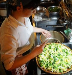 さっと茹でした春キャベツのみずみずしい色の美しさ!店長ミヤザキすかさずうちわであおいで余熱を逃す!と、今夜も「春キャベツと蒸し鶏のサラダ」はつぶマスタードドレッシングで!(お)