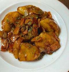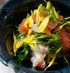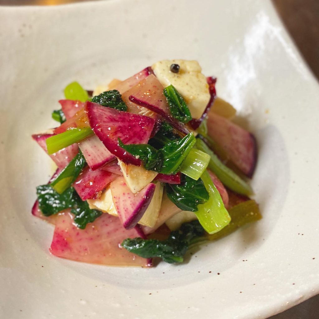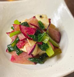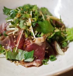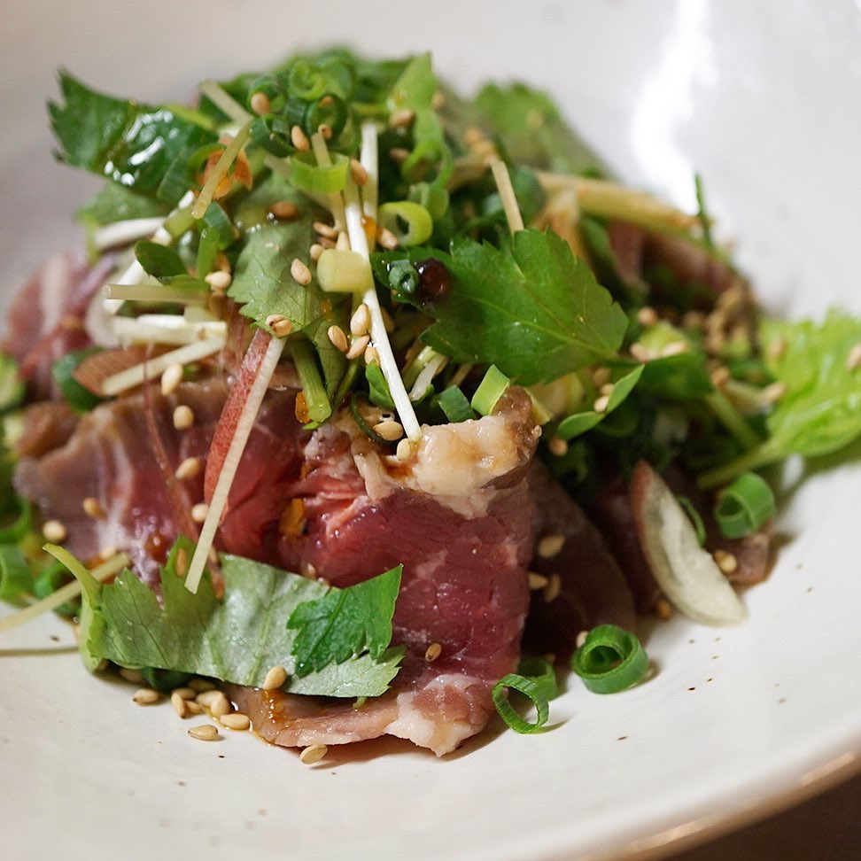 さてと今週はやや和食寄り?と新メニューは「自家製塩麹漬牛のたたき」!いや、旨味マシマシの塩麹漬にした牛肉を網で炙ってさっくりたたき!自家製柚子胡椒ぽん酢でさっぱりスパイシーにどうぞ!(お)