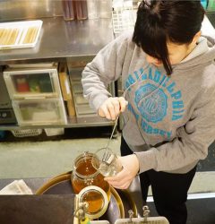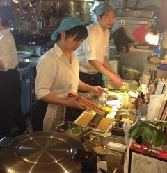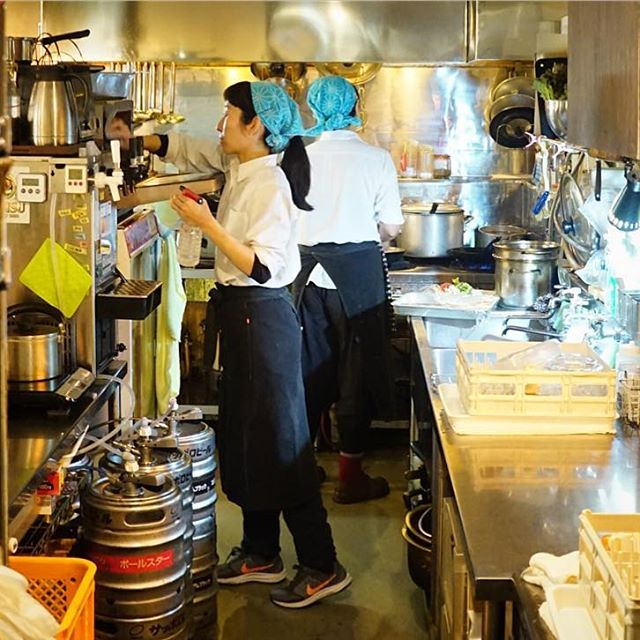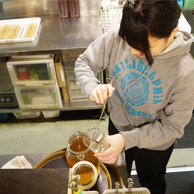 あー、日曜の夜は仕事上がり、今夜の遅番ホールスタッフのミウちゃん、明日年に一度の市民定期検診を受けるナベさんのために、ミックスフルーツ酢ソーダ割りを作ってあげている様子です!(笑)(お)