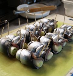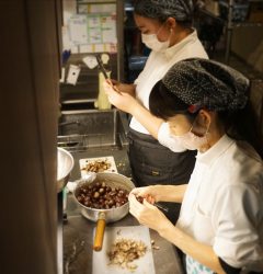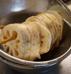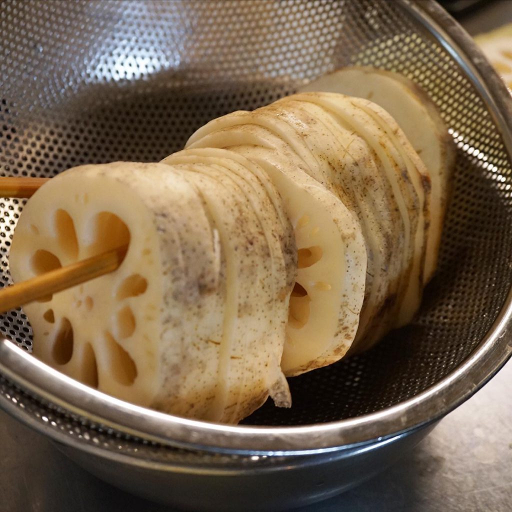 輪切りのれんこんが…ひき肉あんをのっけて…って、そうそう明日金曜日のお昼日替わりは「れんこんと茄子のはさみ揚げ」!キッチンスタッフナベさんがせっせと仕込み中っ!(もちろんこのあと同様に茄子も!)(お)