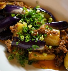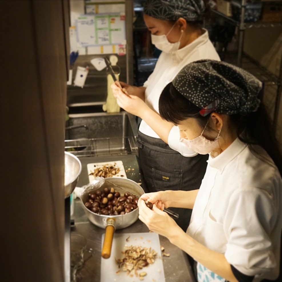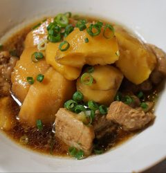 さらに秋の味覚は栗に里芋!ダブルでおいしい!「栗と里芋、豚肉のこっくり煮」!栗の甘味にさっと揚げした里芋のおいしさ!しっかり豚肉の旨味も相まって、こっくり甘辛〜く煮付けた秋の煮物!(お)