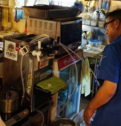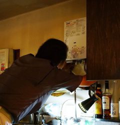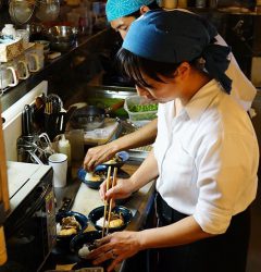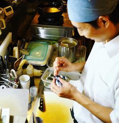 あー、このコーナー、当店裏側をちらりとお見せするよな意図から始まったんだったよなあと、キッチンスタッフはナベさん、今季初の「さんまのたづな揚げ」の下ごしらえ中ですよ(お)