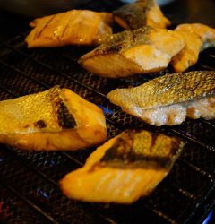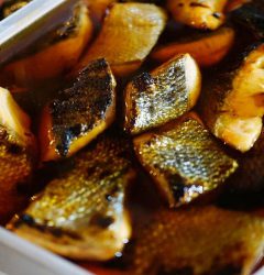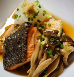じゅうっとこんがり焼いて、やさしいお味のだし汁にひたひたひたした秋鮭にさっくり素揚げにしたかぼちゃとしめじを合わせて、ひんやりしっとり焼きびたし!滋味深〜い旨さですよ!(お)