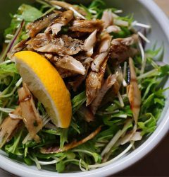 旬のさんまは一夜干しでさくさく葉物野菜のサラダ!「香味野菜と一夜干しのさっぱりサラダ」!お野菜たっぷり!さんまの旨味!自家製のにんにくレモンドレッシングがとにかく旨い!(笑)ぜひ!(お)