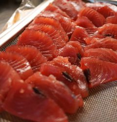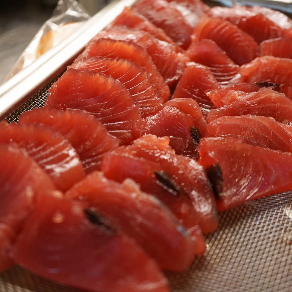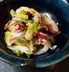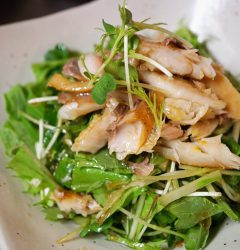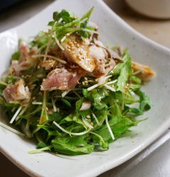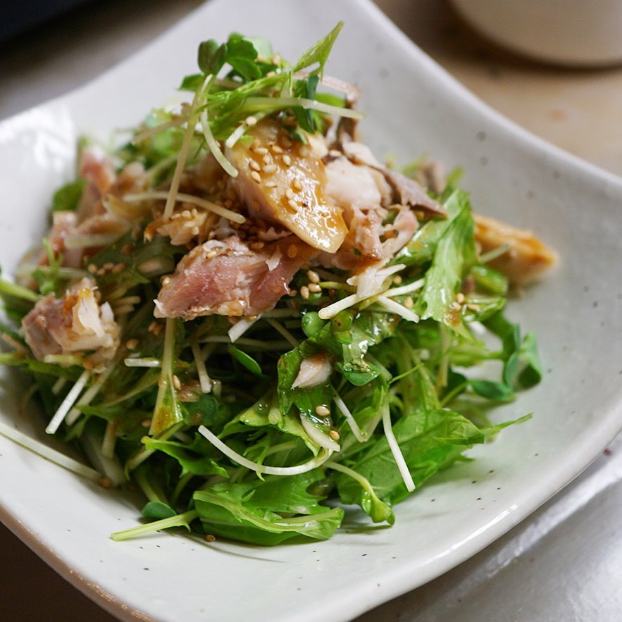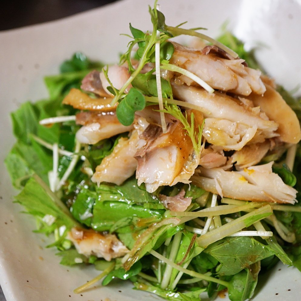さてと久しぶりに登場しておりますお魚サラダは「香味野菜と一夜干しのサラダ」!アジの一夜干しを焼きほぐして、ざくざく香味野菜とあわせたら自家製にんにくレモンドレッシングでさっぱりサラダ!ぜひ!(お)