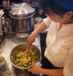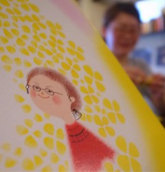 スタッフうめさんのGWは鴨川土産のお菓子…箱のイラストオンナノコ、あれ?この子なんだかうめさんに似てない?と店長ミヤザキ眼鏡とあれこれチョチョイと書き加えたら、ハイ、うめさん!(笑)(お)
