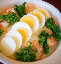 さあさあ今夜のおススメはやっぱりあつあつ!「エビとブロッコリー、ゆで玉子のグラタン」!東京も今週は冷えますからね!元キッチンスタッフはまちゃんち譲りのゆで玉子のグラタンです!(お)