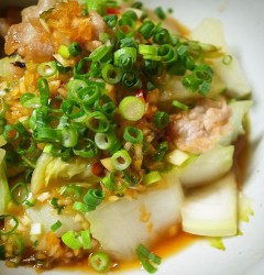 あー、ラーメン画像早くアップしないかな!って待ってる方も多いかな?と(じらしてる訳じゃありませんが)、今夜久しぶりの登場は「白菜と塩豚の酢蒸し」!特性中華香味だれでさっぱりどうそ!(お)
