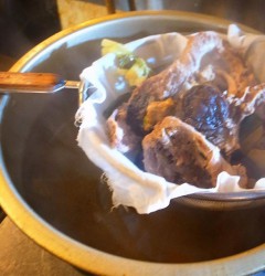 あー、久しぶりの登場は当店きっての?B級メニューではありますがこれがどうして大人気!「ポテサラちくわ天」!熊本のソウルフードはからししょう油で、もちろんそのままでもおいしいよ!(お)